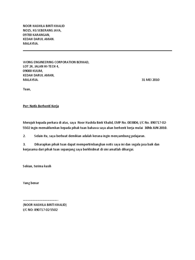 Diharapkan pihak tuan dapat mempertimbangkan notis saya ini dan segala jasa baik dan kerjasama dari pihak tuan sepanjang saya berkhidmat di sini amatlah dihargai. Contoh surat berhenti kerja notis sebulan. Simak dibawah ini contoh surat berhenti kerja notis 24 jam, 1 minggu, dan 1 bulan yang telah bandaronline24jam.com ulas dari berbagai sumber. Perkongsian contoh surat rasmi notis berhenti kerja (resignation letter) adalah dalam bahasa malaysia dan inggeris yang merangkumi notis 2. Saat memutuskan untuk mengundurkan diri dari pekerjaan kita, ada tahapan yang harus dilakukan. Review by admin / 7 years ago — kerja, resume kerja. Ini adalah 4 contoh surat berhenti kerja: Contoh surat perletakan jawatan (24 jam, 2 minggu, sebulan). Notis berhenti kerja 2 minggu. Mengikut surat tawaran kerja, untuk berhenti saya perlu menghantar notis sebulan. Anda ingin pindah kerja disebabkan mendapat tawaran yang lebih baik di tempat lain atau kerja sekarang tidak menarik minat anda untuk bekerja dalam pretasi terbaik anda atau ingin melanjutkan. Jadi, apakah contoh surat berhenti kerja yang betul? Home » contoh surat » surat berhenti kerja » contoh notis berhenti kerja 7 hari, sebulan atau 09000 kulim,kedah darul aman, tuan, notis berhenti kerja.