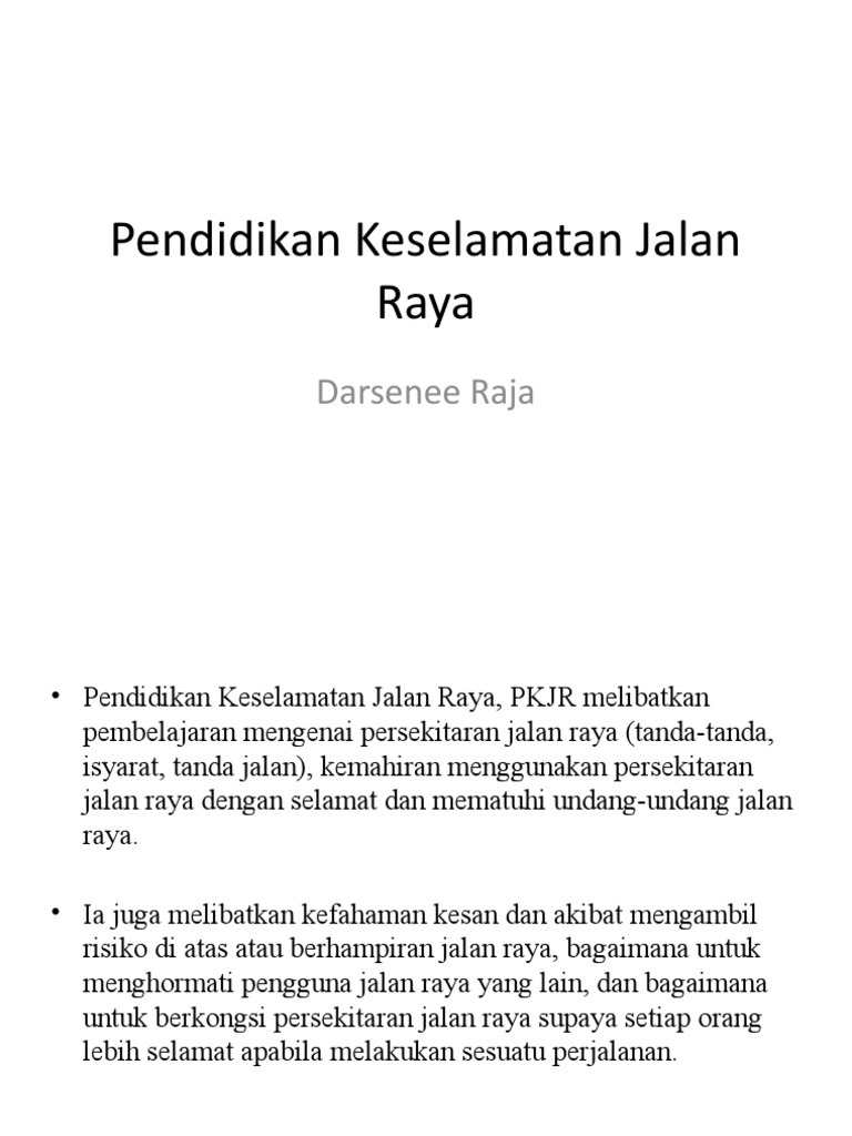 Kemalangan jalan raya yang disebabkan oleh salah laku jalan raya akan akan membawa kerugian besar kepada masyarakat dan negara. Keadaan terhindarnya setiap orang dari risiko kecelakaan selama berlalulintas yang disebabkan oleh manusia, kendaraan, jalan dan / atau lingkungan. Pendidikan untuk mengurangkan salah laku jalan raya perlu dilaksanakan dari semasa ke semasa iaitu sebelum seseorang itu menjadi pemandu, semasa dia menerima latihan pemandu dan setelah. Padahal seharusnya faktor keselamatan di jalan raya. Pendidikan keselamatan jalan raya grade/level: Objektif utama pengajaran dan pembelajaran tahun 1 ialah: Sekolah (halaman, pintu, meja, dll) 2. Masa penyerapan pendidikan keselamatan jalan raya adalah minimum 30 minit dalam tempoh seminggu. Pendidikan keselamatan jalan raya tahun 3. Banyak kecelakaan terjadi justru disebabkan oleh faktor kelalaian penggunanya. Kementerian pengangkutan malaysia dengan kerjasama kpm telah menghasilkan buku panduan guru: Jalan raya merupakan tempat yang berbahaya. Akaun ini merupakan akaun rasmi pendidikan keselamatan jalan raya dan.