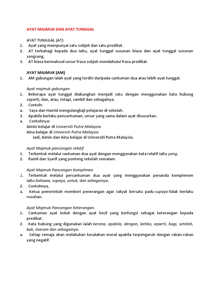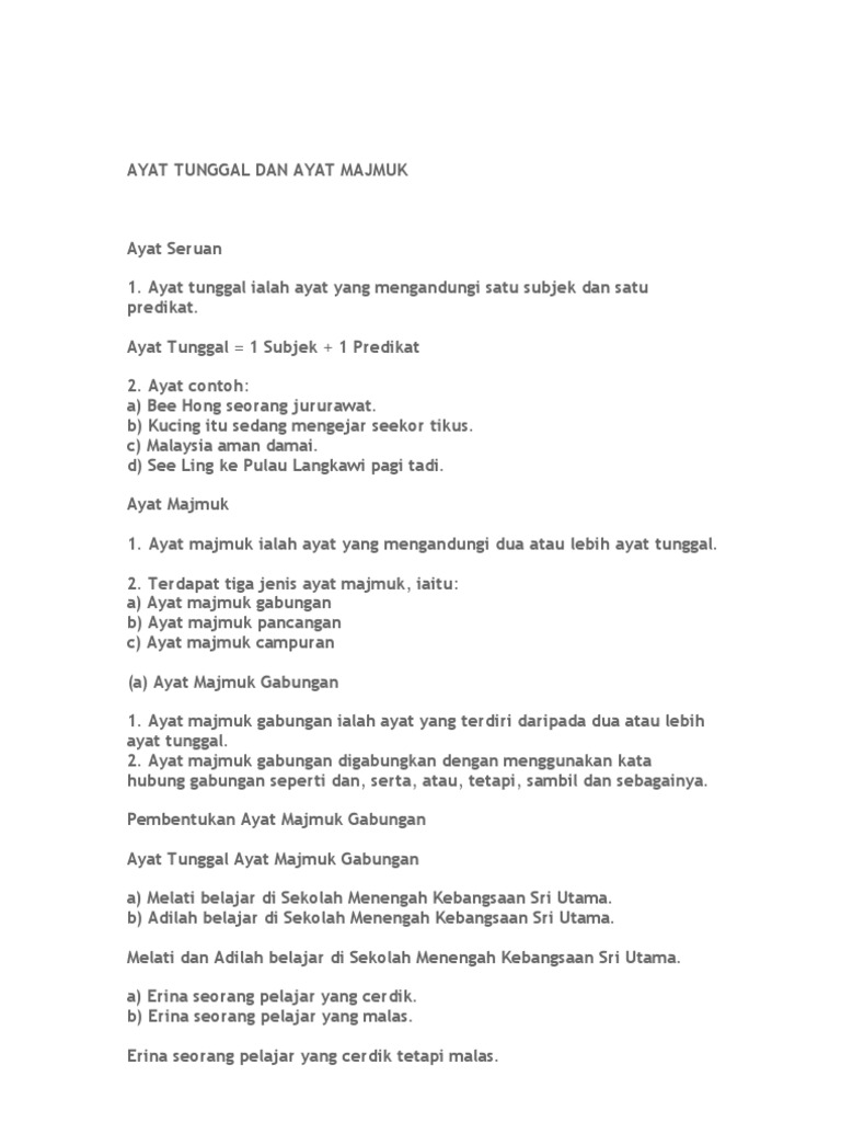 Ayat tunggal mempunyai ciri yang sama dengan ayat dasar. Maksud dan contoh ayat majmukcontoh kata hubung yang boleh digunakanayat majmuk adalah ayat yang berasal daripada dua ayat atau lebih dan digabung menjadi satu ianya digabungkan oleh kata hubung seperti dan sambil lalu kecuali atau sebagai. Kalimat majemuk merupakan penggabungan dua kalimat tunggal dengan menggunakan konjungsi. Cara menukar ayat aktif kepada ayat pasif. Pasangan pelancong asing itu menghulurkan kamera kepada saya. Latihan pengukuhan mencerkin ayat (memisahkan ayat ). Cerakinkan ayat majmuk dalam perenggan di bawan kepada enam ayat tunggal tanpa mengubah maksud asalnya. Tiga jenis seperti yang berikut: Diambil dari arsip resmi kementerian hukum dan ham, bhineka tunggal ikan berasal dari bahasa jawa kuno sangat beragam, sangat majemuk. Ayat tunggal dan ayat majmuk susunan kumpulan. Posted by wong pei feng at 02:37. Ayat tunggal ayat majmuk mp3 & mp4. (i) adakah encik amran hendak ke muzium negara atau ke putrajaya?