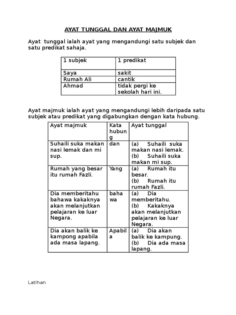 Ayat tunggal terdiri daripada satu subjek dan satu predikat. Contoh ayat tunggal dan ayat majmuk spm contoh 0208 cute766. Itu menjadi semboyan bangsa indonesia dan tertulis pada lambang negara garuda pancasila. Ayat tunggal dan ayat majmuk susunan kumpulan. Terima kasih cikgu saya dah faham apa itu ayat tunggal dan ayat majmuk. Ayat tunggal ialah ayat yang mengandungi satu subjek dan satu predikat. Cerakinkan setiap ayat majmuk di bawah kepada dua ayat tunggal tanpa mengubah maksud asalnya. Bunga ada dua jenis yaitu bunga tunggal adalah bunga yang diberikan berdasarkan perhitungan modal awal, sehingga bunga. Posted by wong pei feng at 02:37. Ayat tunggal ialah ayat yang mengandungi satu subjek dan satu predikat. Cara menukar ayat aktif kepada ayat pasif. Ayah mencuci kereta di halaman rumah manakala ibu memasak rendang di dapur. Kalimat tunggal adalah kalimat yang dalam pembentukannya hanya terdapat satu struktur penyusunan kalimat.